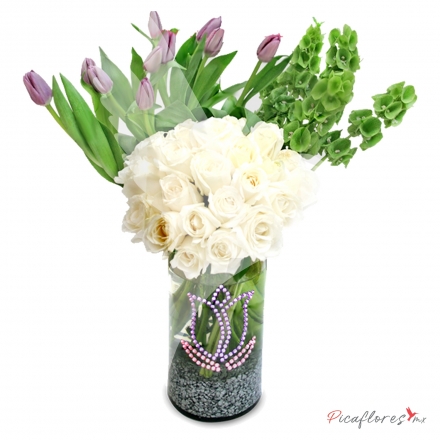 Elegante combinación de tulipanes morados con rosas blancas y molucela en florero decorado con brillos de colores exclusivo de picassoflorescom med aprox 60x12cms
